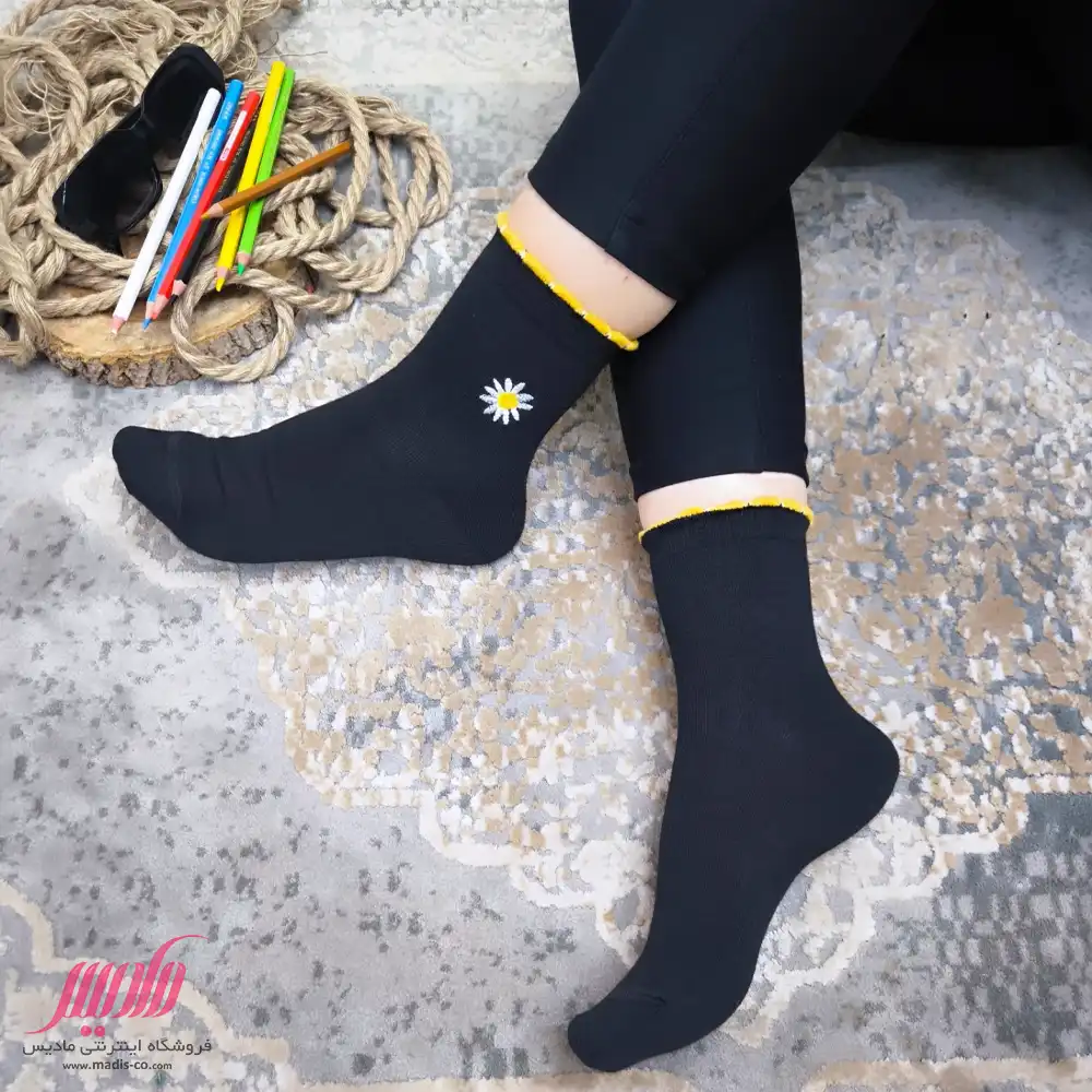* طرح پارچه جوراب بصورت مشکی تک رنگ با طراحی گل بابونه روی قسمت ساق آن است.