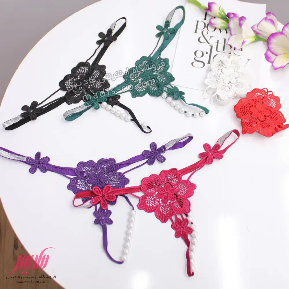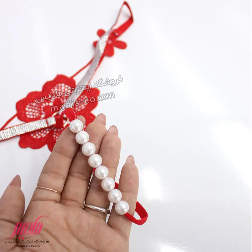 * قسمت جلوی شورت به شکل پروانه، گل، تاج و شکلهای مختلفی کار شده است (که در تصاویر محصول میتوانید این موضوع را مشاهده نمایید) و قسمت میانی آن تعداد 6 الی 9 مروارید زیبا به یکدیگر متصل شده اند.