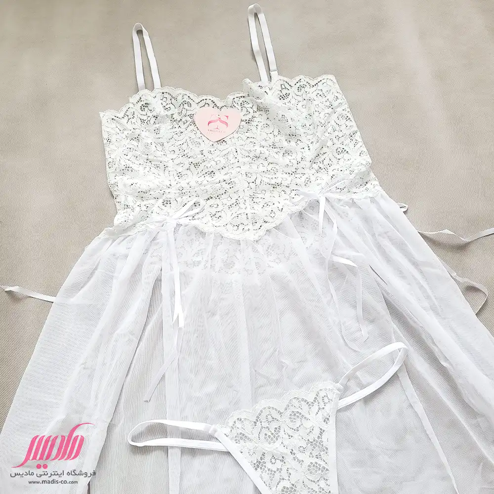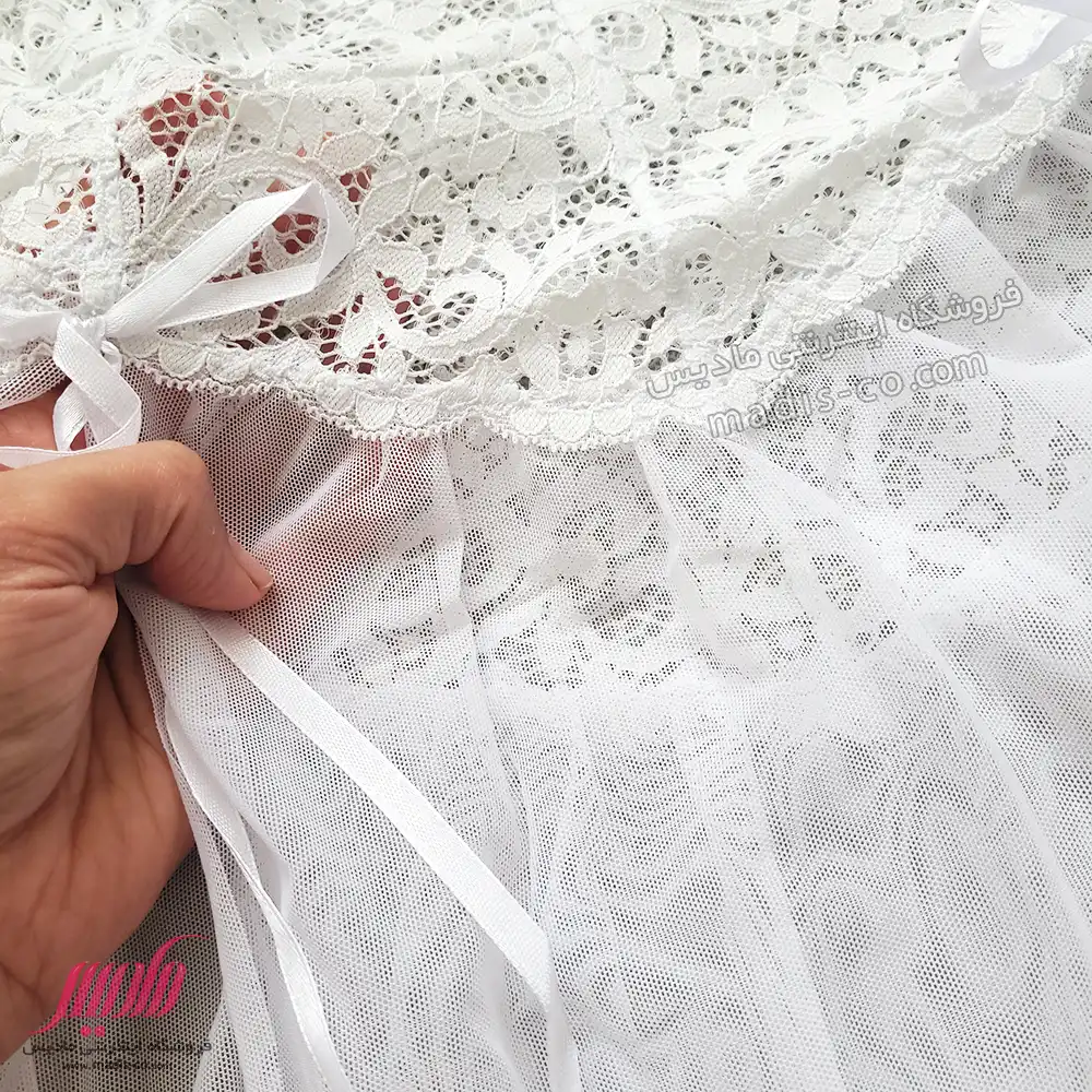 * جنس پارچه به کار رفته در این لباس خواب، ترکیبی از تور ریز بافت (تقریباً به شکل حریر) و دانتل بوده و بسیار لطیف می باشد.